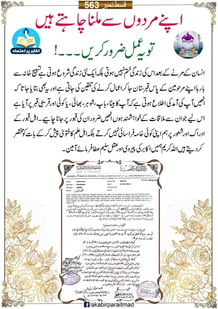 انسان کے مرنے کے بعد اس کی زندگی ختم نہیں ہوتی بلکہ ایک نئی زندگی شروع ہو تی ہےتسبیح خانہ سے بارہا اپنے مرحومین کے پاس قبرستا ن جاکر اعمال کرنے کی تلقین کی جاتی ہے اور یہ بھی بتا یا جاتا کہ انھیں آپ کی آمد کی اطلاع ہوتی ہے کہ آپ کا بیٹا ، باپ ، شوہر ، بھائی ، یا کوئی اور قریبی قبرپر آیا ہے اس لیے جو ان سے ملاقات کے خواہشمند ہوں انھیں ضرور ان کی قبور پر جانا چاہیے ۔اہل قبور کے ادراک اور شعور پر ہم اپنی کوئی خامہ فراسائی نہیں کرتے بلکہ اہل علم کا فتویٰ پیش کر کے بات کو مختصر کردیتے ہیں اللہ کریم ہمیں اکابر کی پیروی اور عقل سلیم عطا فرمائے آمین۔
