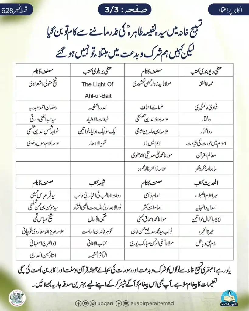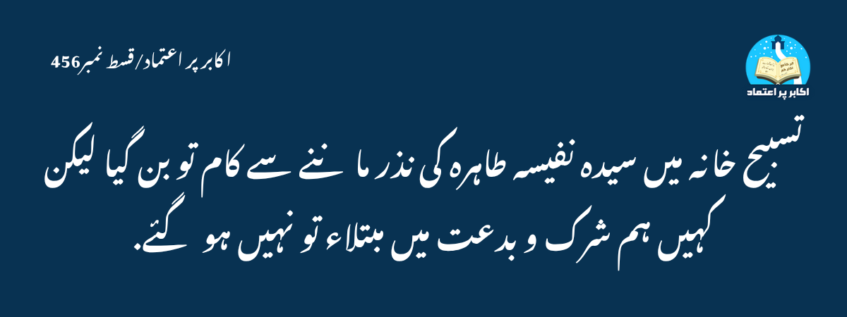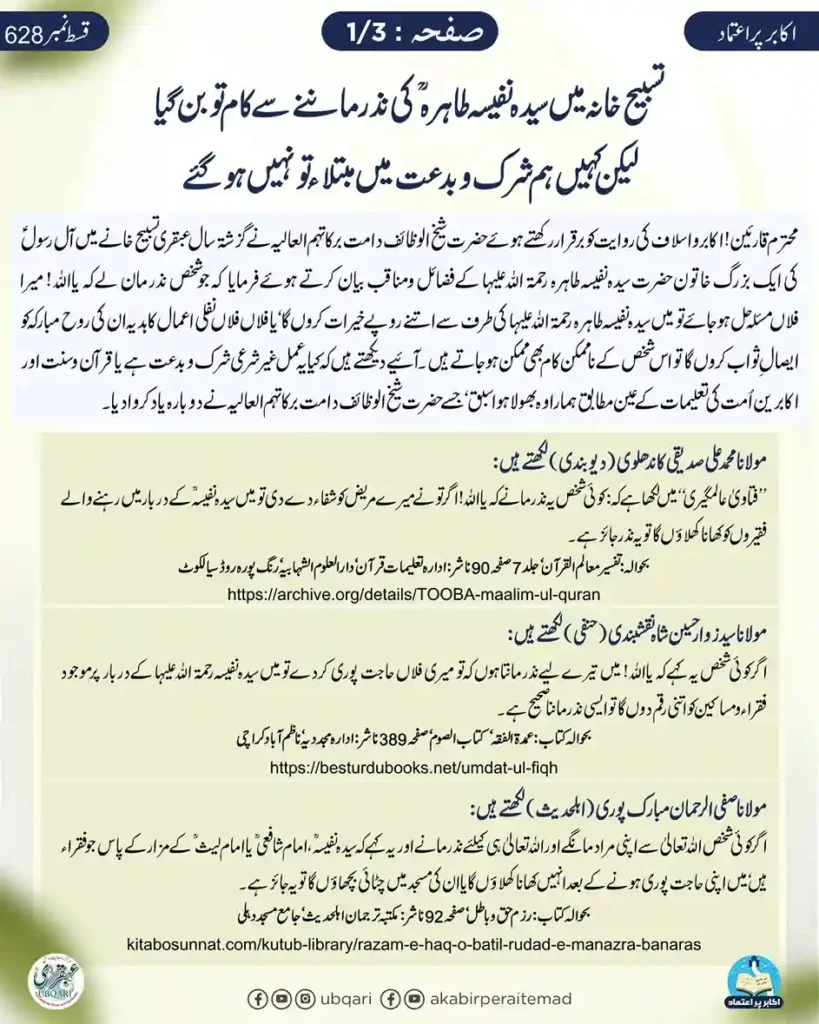 محترم قارئین! اکابر و اسلاف کی روایت کو برقرار رکھتے ہوئے حضرت شیخ الوظائف دامت بر کاتہم العالیہ نے گزشتہ سال عبقری تسبیح خانے میں آل رسول کی ایک بزرگ خاتون حضرت سیدہ نفیسہ طاہرہ رحمتہ اللہ علیہا کے فضائل و مناقب بیان کرتے ہوئے فرمایا کہ جو شخص ندرمان لے کہ یا اللہ ! میرا فلاں مسئلہ حل ہو جائے تو میں سیدہ نفیسہ طاہرہ رحمۃ اللہ علیہا کی طرف سے اتنے روپے خیرات کروں گا یا فلاں فلاں نفلی اعمال کا بد یہ ان کی روح مبارکہ کو ایصال ثواب کروں گا تو اس شخص کے ناممکن کام بھی ممکن ہو جاتے ہیں۔ آئیے دیکھتے ہیںکہ کیا یہ عمل غیر شرعی شرک و بدعت ہے یا قرآن وسنت اور اکابرین امت کی تعلیمات کے عین مطابق ہمارا وہ بھولا ہوا سبق، جسے حضرت شیخ الوظائف دامت برکاتہم العالیہ نے دوبارہ یاد کروادیا۔