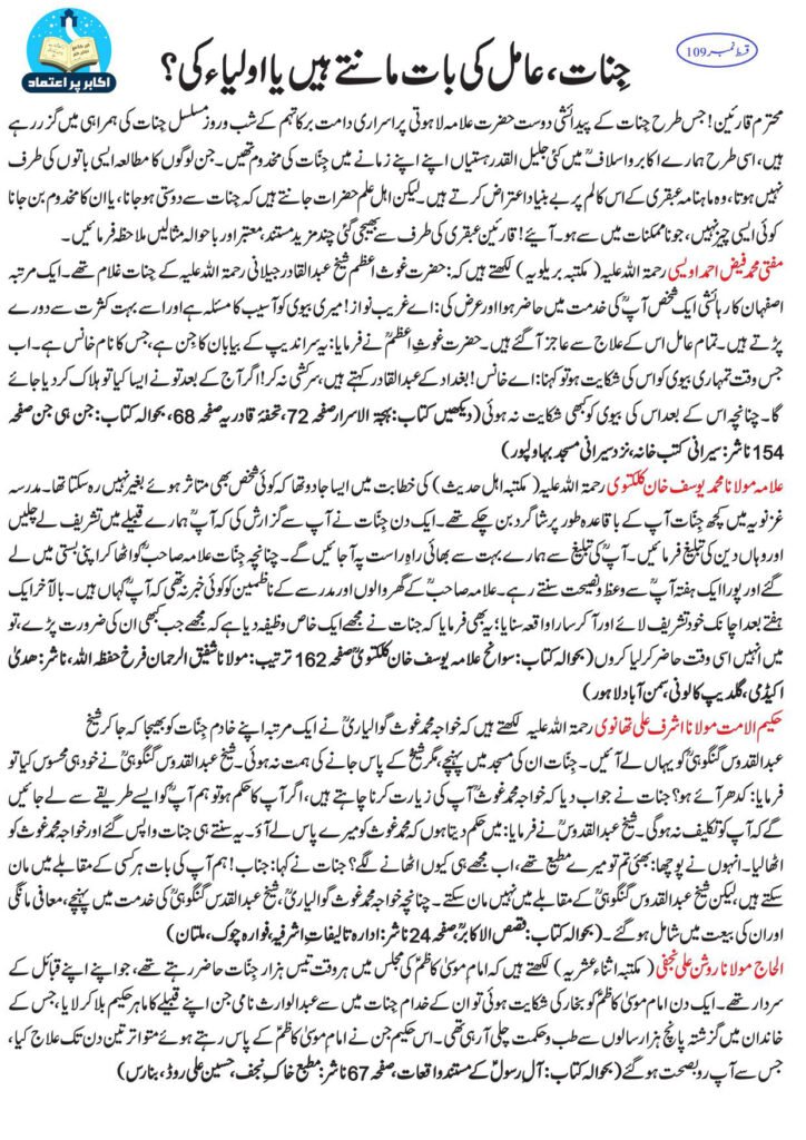 محترم قارئین ! جس طرح جنات کے پیدائشی دوست حضرت علامہ لاہوتی پراسراری دامت برکاتہم کے شب و روز مسلسل جنات کی ہمراہی میں گزر رہے ہیں، اسی طرح ہمارے اکابر و اسلاف میں کئی جلیل القدر ہستیاں اپنے اپنے زمانے میں جنات کی مخدوم تھیں۔ جن لوگوں کا مطالعہ ایسی باتوں کی طرف نہیں ہوتا ،وہ ماہنامہ عبقری کے اس کالم پر بے بنیاد اعتراض کرتے ہیں۔ لیکن اہل علم حضرات جانتے ہیں کہ جنات سے دوستی ہو جانا ، یا ان کا مخدوم بن جانا ، کوئی ایسی چیز نہیں، جونا ممکنات میں ۔ آئیے قارین عبقری سے بھیجی گئی چند مزید مستند معتبر اور باحوالہ مثالیں ملاحظہ فرمائیں۔