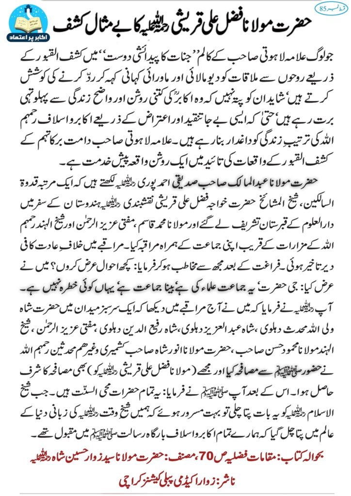 بحوالہ کتاب : مقامات فضلیہ ص 70 ، مصنف : حضرت مولانا سید زوار حسین شاه رحمة الله عليہ