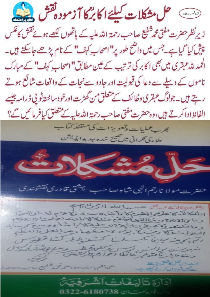 زیر نظر حضرت مفتی محمد شفیع صاحب رحمۃ اللہ علیہ کے ہاتھوں لکھے ہوئے نقش کا عکس پیش کیا گیا ہے۔ جس میں واضح طور پر ” اصحاب کہف” کے نام پڑھے جاسکتے ہیں۔ الحمد للہ عبقری میں بھی اکابر کی ترتیب کے عین مطابق ” اصحاب کہف” کے مبارک ناموں کے وسیلے سے دعا کی قبولیت اور جادو سے نجات کے واقعات شائع ہوتے رہتے ہیں۔ جو لوگ عبقری وظائف کے متعلق من گھڑت اور خود ساختہ ٹوپی ڈرامہ جیسے الفاظ ادا کرتے ہیں ، وہ حضرت مفتی صاحب رحمۃ اللہ علیہ کے متعلق کیا فرمائیں گے؟