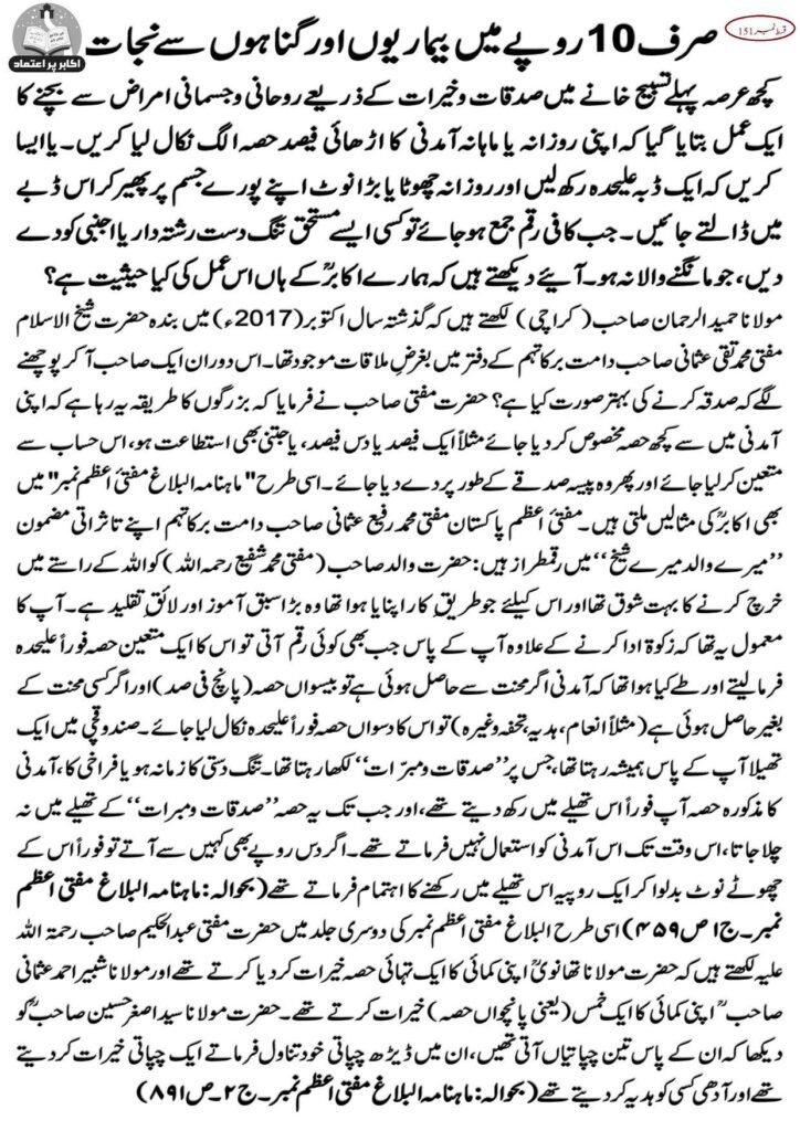 کچھ عرصہ پہلے تسبیح خانے میں صدقات و خیرات کے ذریعے روحانی و جسمانی امراض سے بچنے کا ایک عمل بتایا گیا کہ اپنی روزانہ یا ماہانہ آمدنی کا اڑھائی فیصد حصہ الگ نکال لیا کریں۔ یا ایسا کریں کہ ایک ڈبہ علیحدہ رکھ لیں اور روزانہ چھوٹا یا بڑا نوٹ اپنے پورے جسم پر پھیر کر اس ڈبے میں ڈالتے جائیں۔ جب کافی رقم جمع ہو جائے تو کسی ایسے مستحق تنگ دست رشتہ دار یا اجنبی کو دے دیں، جو مانگنے والا نہ ہو۔ آئیے دیکھتے ہیں کہ ہمارے اکابر کے ہاں اس عمل کی کیا حیثیت ہے؟ مولانا حمید الرحمان صاحب (کراچی) لکھتے ہیں کہ گزشتہ سال اکتوبر (2017ء) میں بندہ حضرت شیخ الاسلام مفتی محمد تقی عثمانی صاحب دامت برکاتہم کے دفتر میں بغرض ملاقات موجود تھا۔ اس دوران ایک صاحب آکر پوچھنے لگے کہ صدقہ کرنے کی بہتر صورت کیا ہے؟ حضرت مفتی صاحب نے فرمایا کہ بزرگوں کا طریقہ یہ رہا ہے کہ اپنی آمدنی میں سے کچھ حصہ مخصوص کر دیا جائے مثلاً ایک فیصد یا دس فیصد، یا جتنی بھی استطاعت ہو، اس حساب سے متعین کر لیا جائے اور پھر وہ پیسہ صدقے کے طور پر دے دیا جائے۔