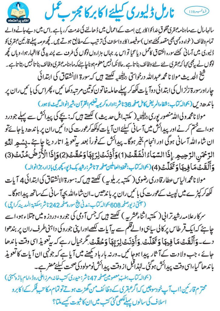 مولانا محمد الیاس عطار قادری رضوی ( مکتبہ بریلویہ ) لکھتے ہیں کہ : سورۃ الانشقاق کی ابتدائی 4 آیات لکھ کر کپڑے میں لپیٹ کے عورت کی بائیں ران پر باندھیں ۔ ان شاء اللہ بچہ آسانی کے ساتھ پیدا ہوگا۔
