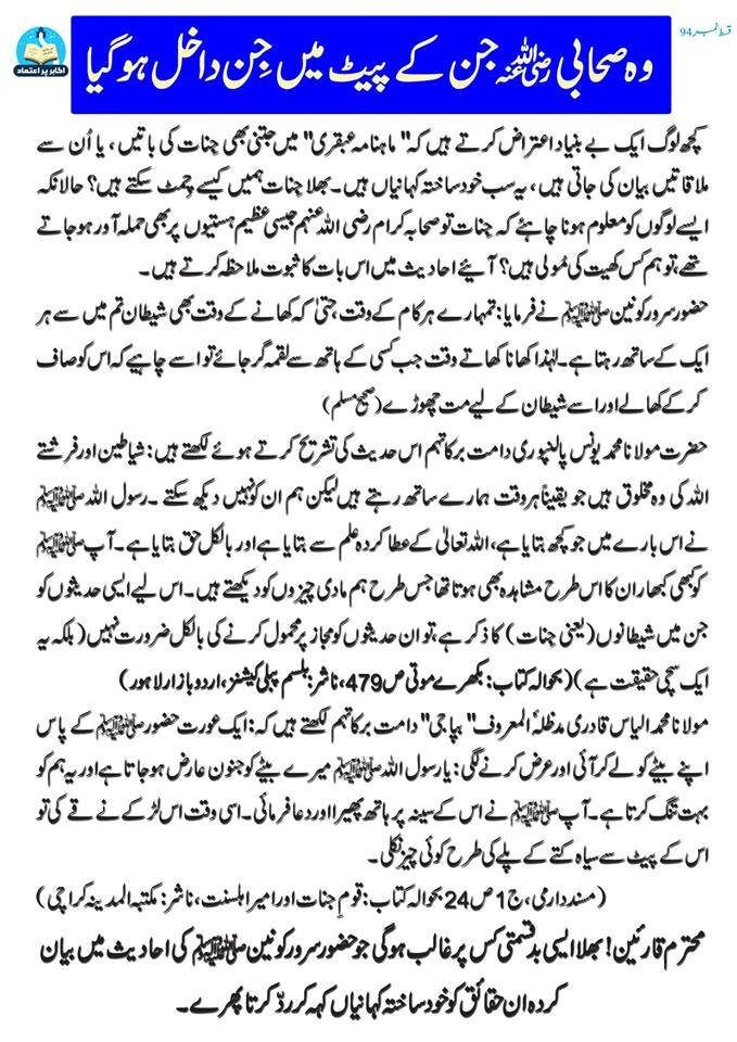 کچھ لوگ ایک بے بنیاد اعتراض کرتے ہیں کہ ماہنامہ "عبقری” میں جتنی بھی جنات کی باتیں یا اُن سے ملاقاتیں بیان کی جاتی ہیں، یہ سب خود ساختہ کہانیاں ہیں۔ بھلا جنات ہمیں کیسے چمٹ سکتے ہیں؟ حالانکہ ایسے لوگوں کو معلوم ہونا چاہیے کہ جنات تو صحابۂ کرام رضی اللہ عنہم جیسی عظیم ہستیوں پر بھی حملہ آور ہو جاتے تھے، تو ہم کس کھیت کی مولی ہیں؟