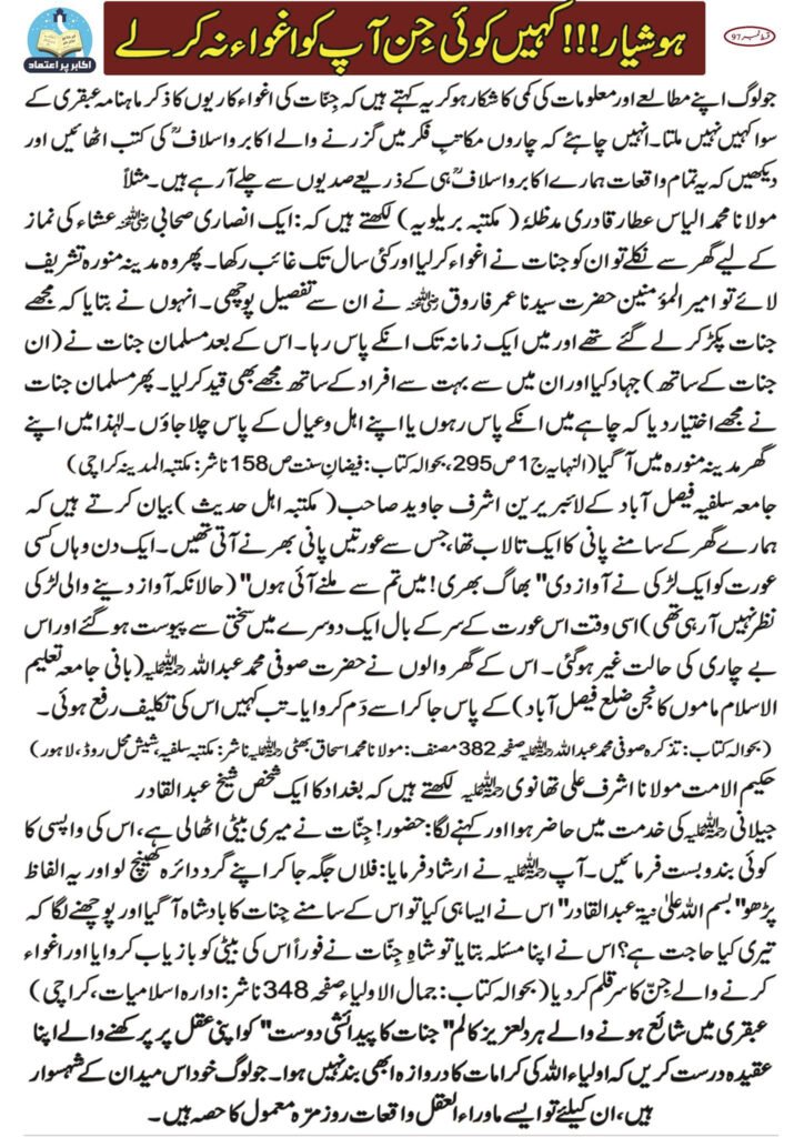 جو لوگ اپنے مطالعے اور معلومات کی کمی کا شکار ہو کر یہ کہتے ہیں کہ "جنات کی اغوا کاریوں” کا ذکر ماہنامہ عبقری کے سوا کہیں نہیں ملتا، انہیں چاہیے کہ چاروں مکاتبِ فکر کے اکابر و اسلاف کی کتب کا مطالعہ کریں۔ یہ تمام واقعات صدیوں سے ہمارے اکابر و مشائخ کے ذریعے محفوظ چلے آ رہے ہیں۔