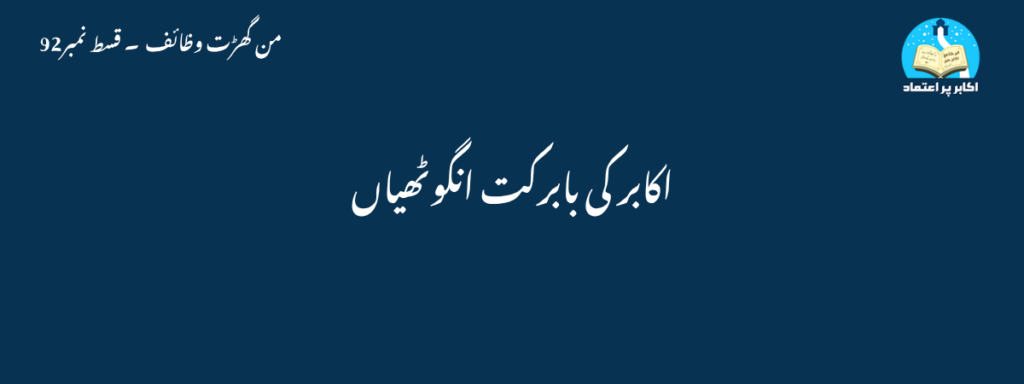 بعض اوقات عبقری میں کچھ انگوٹھی اور چھلے وغیرہ پر کچھ عبارت لکھنے کے عمل کا ذکر ہوتا ہے بہت سے دوست اکابر و اسلاف کی زندگی سے نا آشنائی کے سبب سے کہتے ہیں کہ یہ سب بیکار باتیں ہیں ایسے حضرات کیلئے بجائے اپنی طرف سے کچھ کہنے کے اکابر کا ایک فتویٰ لکھا جاتا ہے جس سے آپ کو اندازہ ہو جائے گا کہ عبقری میں ایک بھی چیز اپنی طرف سے نہیں بلکہ اکا بر کی زندگی کا سو فیصد عکس پیش کیا جاتا ہے۔ (1) آپ صلى الله عليه وسلم نے ایک انگوٹھی چاندی کی بنوائی اور اس پر محمد رسول اللہ نقش کروایا۔ (بحوالہ صحیح بخاری ص (873) – (2) حضرت حذیفہ رضى الله عنہ کی انگوٹھی پر الحمد للہ لکھا تھا۔ (3) حضرت مسروق ” کی انگوٹھی پر بسم اللہ لکھی تھی۔ (4) حضرت جعفر رضى الله عنہ کی انگوٹھی پر العزت اللہ لکھا تھا۔ (5) ابراہیم نخعی کی انگوٹھی پر یااللہ لکھا ہوا تھا (فتح الباری ج 10 ص 328 ) (6) حضرت صدیق اکبر رضى الله عنہ کی انگوٹھی پر نعم القادر اللہ لکھا تھا ( شرح طحاوی ص 354) (7) حضرت عبداللہ بن عمر بن رضى الله عنہ اور قاسم بن محمد رحمة الله عليه کی انگوٹھی پر نعم القادر اللہ لکھا تھا۔ (8) امام ابن سیرین فرماتے ہیں انگوٹھیوں پر حسبی اللہ لکھا ہونے میں کوئی حرج نہیں ۔ ( جمع الوسائل ص 184) (9) حضرت عمر رضی اللہ عنہ کی انگوٹھی پر کفی بالموت واعظا لکھا تھا۔ حضرت عثمان رضی اللہ عنہ کی انگوٹھی پر لتصر بن اولتند من لکھا تھا۔ (10) حضرت علی رضی اللہ عنہ کی انگوٹھی پر الملک اللہ لکھا تھا۔ (11) حضرت امام ابوحنیفہ رحمہ اللہ کی انگوٹھی پر قل الخير والا فاسكت لکھا تھا۔ (12) امام ابو یوسف کی انگوٹھی پر من عمل برابه فقد ندم لکھا تھا ۔ (13) امام محمد کی انگوٹھی پر من صبر ظفر لکھا تھا۔ (14) حضرت مولانا اشرف علی تھانوی کی انگوٹھی پر من صبر ظفر لکھا تھا اور دوسری پر از گروه اولیاء اشرف علی لکھا تھا۔ ملا علی قاریرحمة الله علیہ نے لکھا ہے کہ انگوٹھی پر اللہ کے ناموں میں سے کوئی نام کندہ کرانا اور پہننا جائز ہے اس سے معلوم ہوا کہ انگوٹھیوں پر جو تعویذات لکھے ہوتے ہیں ( مقطعات قرآنیہ یا دیگر کلمات و دعائیں ) ان کا پہننا درست ہے اور ان کو ممنوع قرار دینا مطلقاً درست نہیں نہ اس میں کوئی قباحت ہے البتہ بے ادبی سے بچانا لازم ہے ۔ (شمائل کبری ج 2 ص 152 بحوالہ کتاب بکھرے موتی حصہ 5 ص 479 ، مصنف : حضرت مولا نا محمد یونس پالنپوری حفظہ اللہ، ناشر بلسم پبلی کیشنز، لاہور )