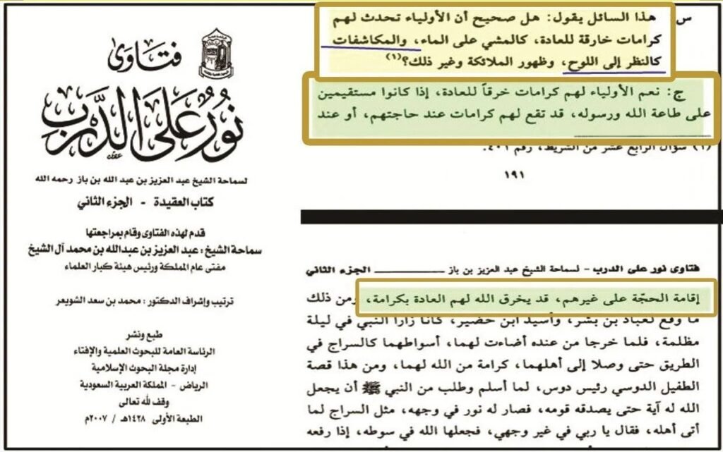 قارئین! اگر کسی کو اتنا شرح صدر حاصل نہیں تو اس میں اولیاء اللہ کا کیا قصور؟ اہل علم حضرات کیلئے تو ایسے واقعات کوئی نئی بات نہیں ہیں۔ ذیل میں مفتی اعظم سعودیہ حضرت شیخ عبدالعزیز بن باز رحمۃ اللہ علیہ کا فتویٰ آپ کے سامنے ہے کہ کسی شخص نے ان سے پوچھا: کیا اولیاء اللہ ہستیوں کیلئے پانی پر چلنے جیسی کرامت اور لوح محفوظ کی عبارت پڑھنے یا فرشتوں کو آنکھوں سے دیکھ لینے جیسا کشف ممکن ہے؟ فرمایا: ہاں بالکل! جب اولیائے کرام اللہ تعالیٰ اور اس کے رسول ﷺ کی اطاعت پر استقامت اختیار کریں تو ان کی حاجت پوری کرنے کیلئے یا دوسروں پر حجت قائم کرنے کیلئے ایسی کرامات کا ظہور ہو جاتا ہے۔ جیسا کہ احادیث میں حضرت عباد بن بشر اور حضرت اسید بن حضیر رضی اللہ عنہما کے بھی خرق عادت واقعات ملتے ہیں۔